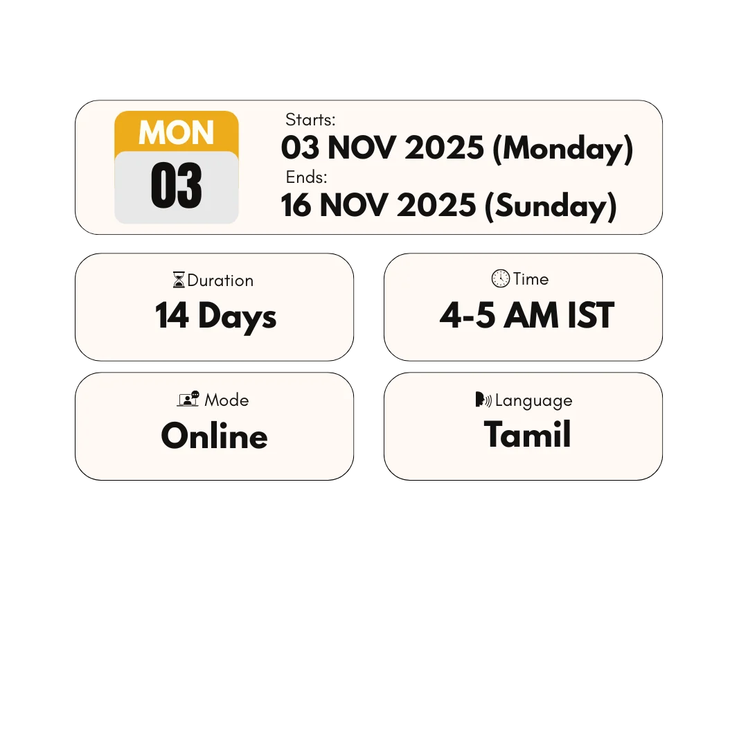 The Brahma Muhurta Program is a live, structured 14-day journey where Thirumaran sir personally teaches and guides every morning session.
